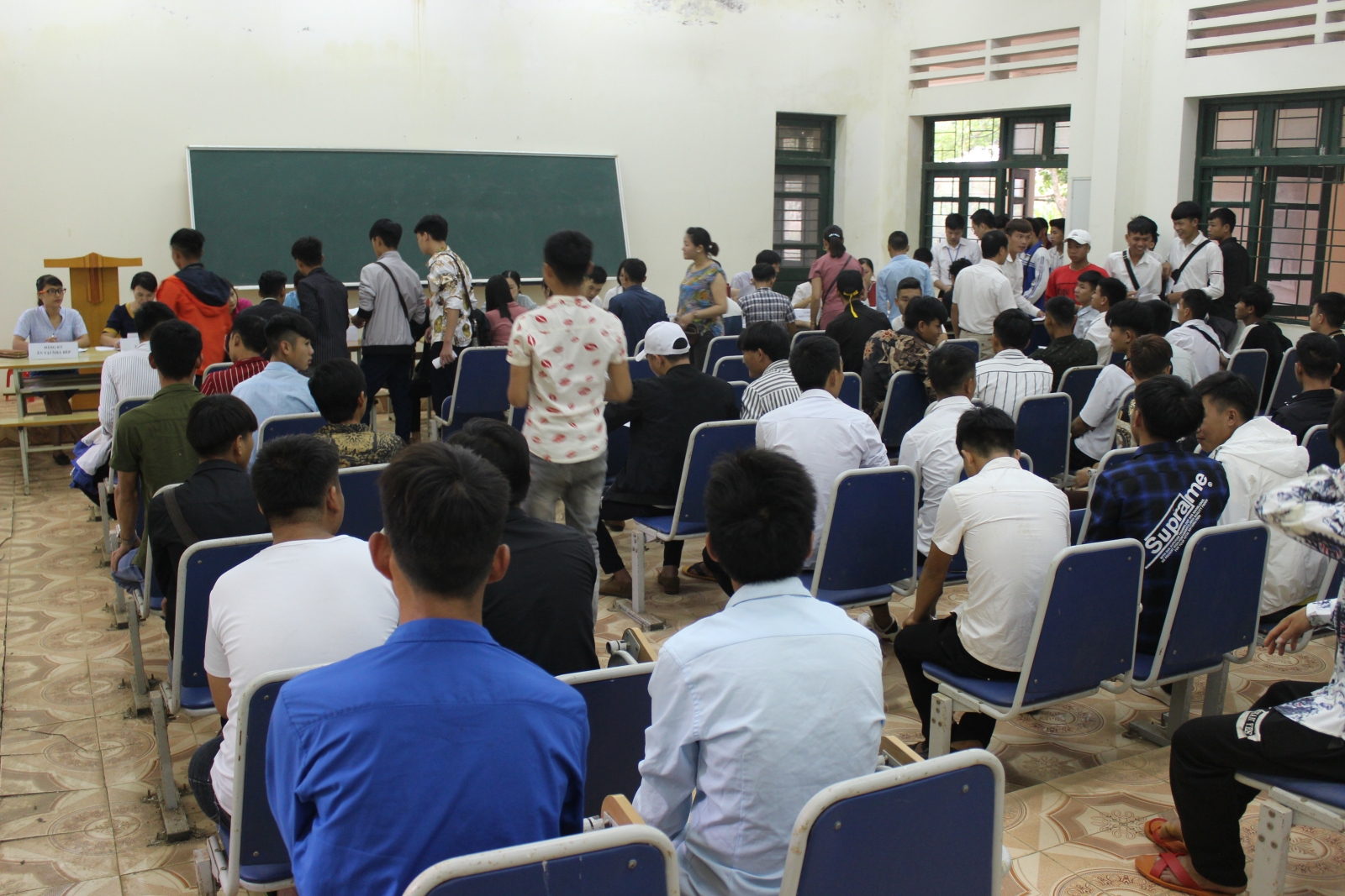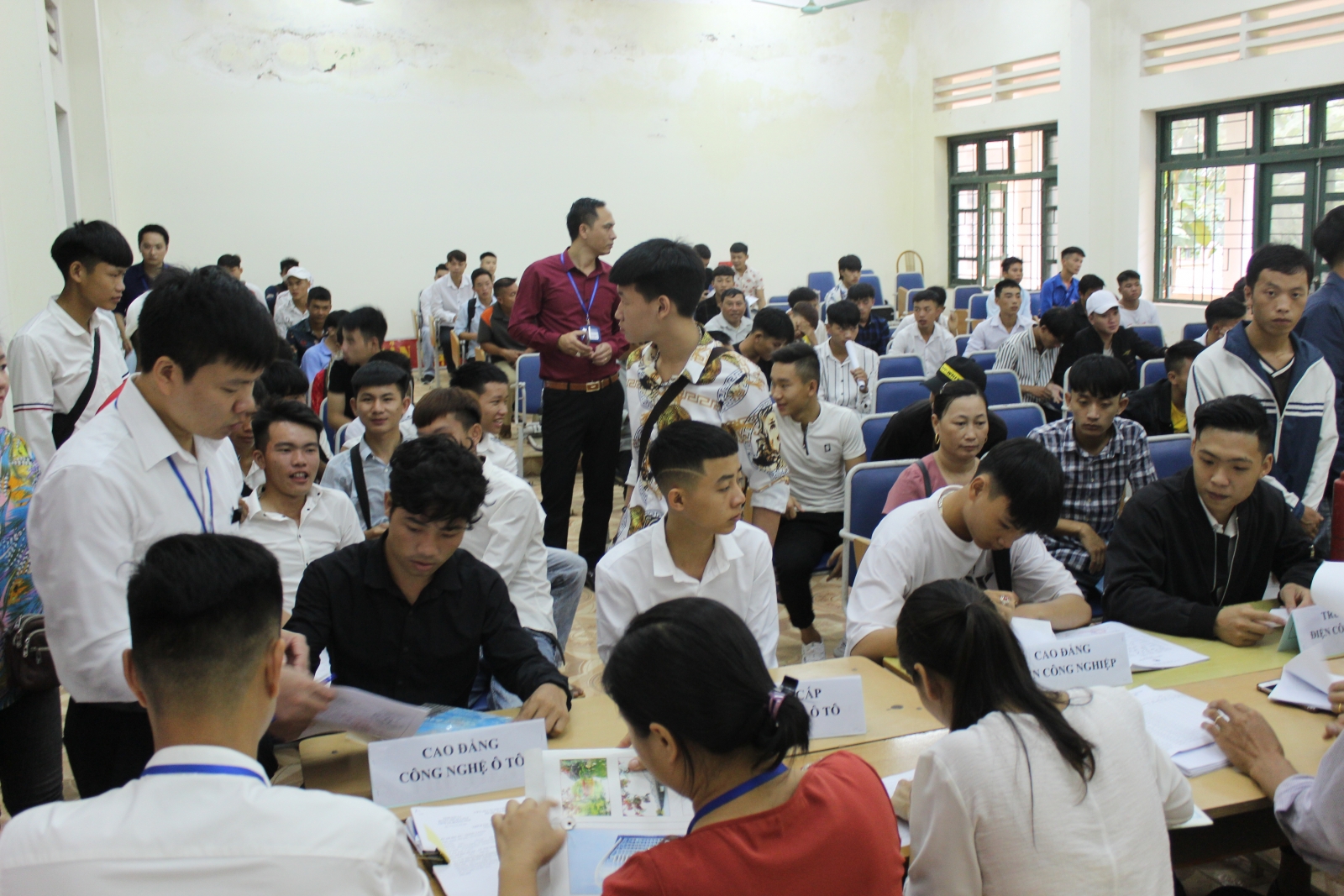 Toàn cảnh hội trường làm thủ tục nhập học cho tân học sinh, sinh viên Từ 7 giờ 15 phút, toàn thể cán bộ giảng viên và các bộ phận được phân công nhiệm vụ tiếp sinh đã sẵn sàng cho việc tiếp đón, giải quyết các thủ tục nhập học cho các HSSV. Nhà trường đã bố trí các bàn tư vấn để đảm bảo các điều kiện thuận lợi nhất cho HSSV và các phụ huynh hỗ trợ con em mình hoàn thành nhanh chóng các thủ tục nhập học. Hòa cùng nụ cười của các thí sinh khi trúng tuyển trở thành các tân HSSV là những nụ cười tin tưởng trong niềm tự hào của các bậc phụ huynh khi con em mình được trúng tuyển vào học tại trường Cao đẳng kỹ thuật công nghệ Sơn La. Để tạo thuận lợi cho phụ huynh cũng như các tân sinh viên, Nhà trường đã xây dựng kế hoạch, bố trí địa điểm để đón tiếp và tạo điều kiện để các em làm thủ tục được thuận lợi, nhanh chóng. Quá trình làm thủ tục nhập học được tiến hành nhanh, gọn, khoa học với sự hướng dẫn nhiệt tình của cán bộ phụ trách làm hồ sơ cũng như sinh viên tình nguyện nên hầu hết phụ huynh, tân học sinh, sinh viên đều cảm nhận được sự thoải mái ngay từ lần đầu tiên đến trường. Chia sẻ cảm xúc trong ngày đầu nhập học, nhiều tân HSSV cho biết: Chúng Em rất ấn tượng bởi khuân viên Nhà trường rất đẹp và khang trang; sự thân thiện, nhiệt tình của các thầy cô và anh chị sinh viên tình nguyện đã giúp em làm thủ tục nhập học rất nhanh chóng. Các tân HSSV từ đây sẽ bước vào một hành trình mới quan trọng và đẹp đẽ trong cuộc đời của mình, đó là học tập và rèn luyện tay nghề trong môi trường chuyên nghiệp để tích lũy và chuẩn bị cho mình những hành trang cho tương lai. Trường Cao đẳng kỹ thuật công nghệ Sơn La sẽ là nơi chắp cánh ước mơ, trang bị cho các em hành trang tri thức, kỹ năng nghề nghiệp để các em bay cao, bay xa trên con đường lập thân lập nghiệp. Chúc các bạn tân Học sinh sinh viên sẽ có tâm thế vững vàng, tràn đầy năng lượng, ý chí, trưởng thành hơn từng ngày trong môi trường học tập mới; trở thành những sinh viên năng động, con người có ích và thành công với những ước mơ, hoài bão của mình, để hoàn thành thật tốt những năm học dưới mái trường Cao đẳng kỹ thuật công nghệ Sơn La - mái trường với lịch sử 46 năm xây dựng và phát triển trong xu thế hội nhập. Một số hình ảnh nhập học của Học sinh, sinh viên