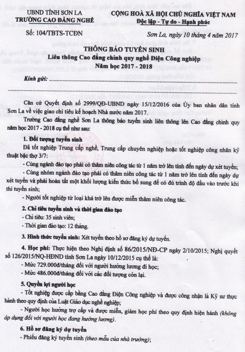 Tuyển sinh liên thông CĐ chính quy nghề Điện công nghiệp năm 2017